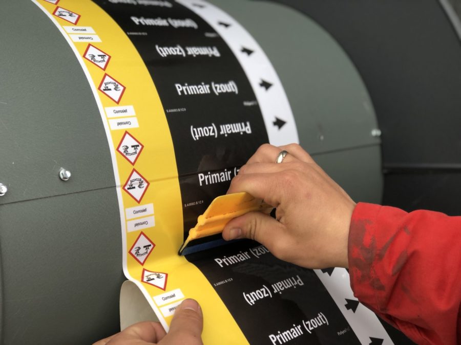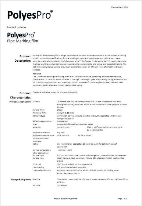 PolyesPro®-rörmärkningar har ett antal unika egenskaper som har möjliggjorts av 3M™s senaste innovationer inom lim och färgäkthet. Nyckelegenskapen är ett flytande akrylbaserat limskikt över 120 mikron tjockt. Detta gör att etiketterna kan appliceras på nästan alla typer av rör, även målade sådana med en liten struktur. Att använda 3M™-konfigurerade maskiner och 3M™-bläck säkerställer en exceptionellt långvarig färgäkthet hos bilden. Detta innebär att informationsöverföring av hög kvalitet säkerställs; markeringarna förblir läsbara och igenkännbara både vad gäller färgen och säkerhetssymbolerna som används.