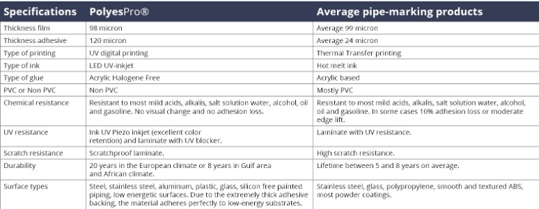 Vad skiljer PolyesPro® från andra välkända rörmärkningsleverantörer i världen? I tabellen nedan jämför vi PolyesPro® med de genomsnittliga rörmärkningsprodukter som finns tillgängliga för närvarande.